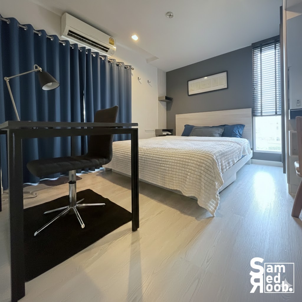 ขนาด 32.32 ตรม. ห้องหัวมุม 1 ห้องนอน 1 ห้อง นั่งเล่น+ครัว 1 ห้องน้ำ บิ้วอินเคาน์เตอร์บาร์และชั้นหนังสือ