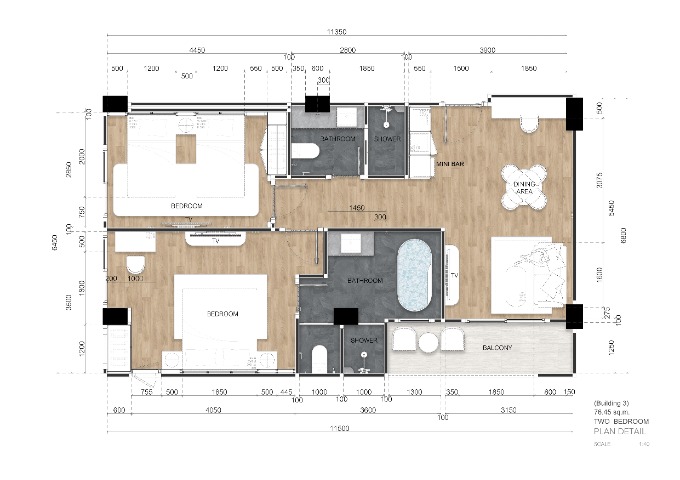 2 ห้องนอน 2 ห้องน้ำ ชั้น 3 อาคาร 4 ขนาด 78.18 ตร.ม.