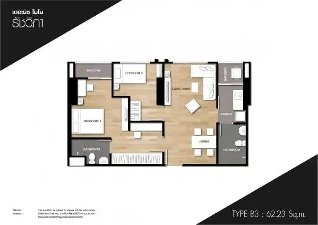 ขาย 2 ห้องนอน แบบ B1 ขนาด 61 ตร.ม. อาคาร B