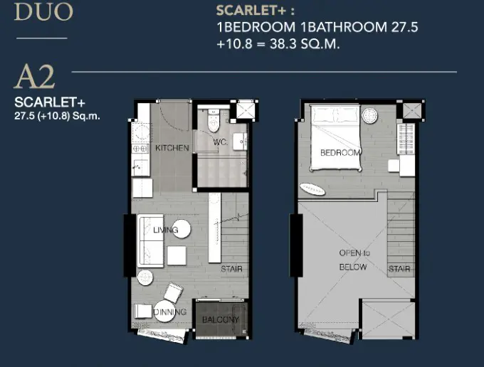 ขาย 1 ห้องนอน สไตล์ลอฟท์ Type A2 ชั้น 28 ขนาดพื้นที่ใช้สอยรวม 38.3 ตร.ม. (ชั้นล่าง 34.7 ตร.ม. + ชั้นบน 15.2 ตร.ม.) แบบ 1 ห้องนอน 1 ห้องน้ำ 1 ห้องนั่งเล่น