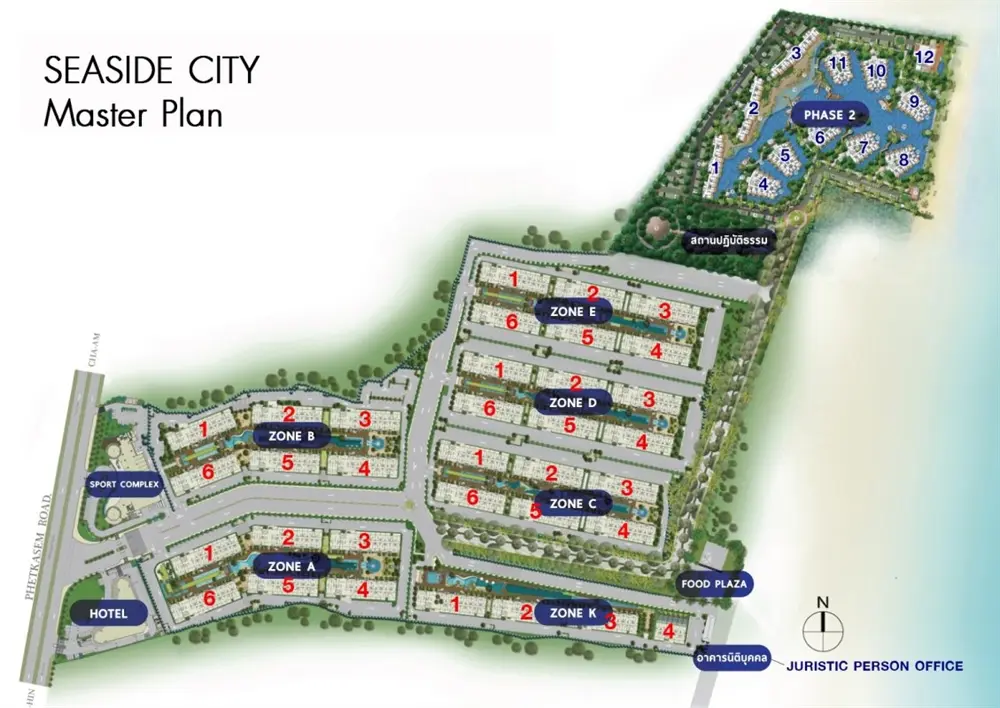 SEASIDE CITY คอนโดหัวหินติดทะเลสไตล์โคโลเนียล แบ่งออกเป็น 6 โซน แต่ละโซนจะประกอบไปด้วยอาคารแบบ Low Rise สูง 8 ชั้นจำนวน 6 อาคาร โดยแต่ละโซนจะมีสระว่ายน้ำยาวประมาณ 200 เมตร แบ่งเป็นสระว่ายน้ำสำหรับผู้ใหญ่ สระว่ายน้ำสำหรับเด็ก, JACUZZI และสนามเด็กเล่น อยู่ในบริเวณส่วนกลาง จำนวนยูนิตรวม 5,997 ยูนิต