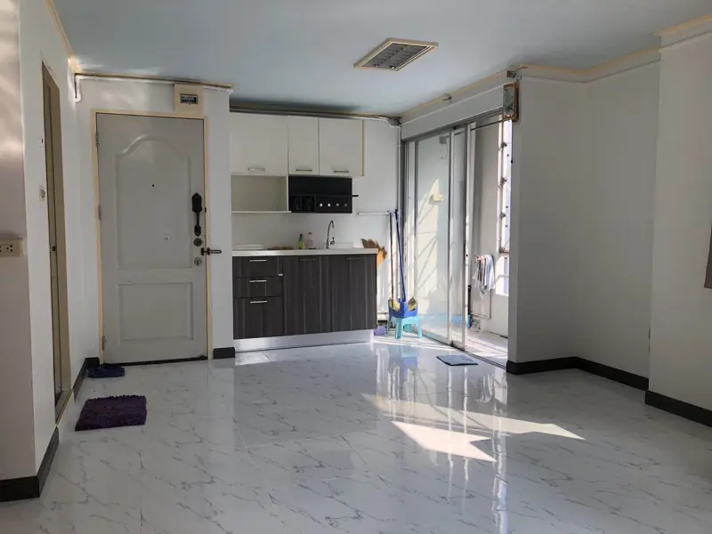 เป็นห้องมุม หน้าต่างรอบด้าน มีลมธรรมชาติ พื้นห้องปูกระเบื้องใหม่ ทาสีใหม่ ติดผ้าม่านใหม่ ติดตั้งครัวบิ้วอิน