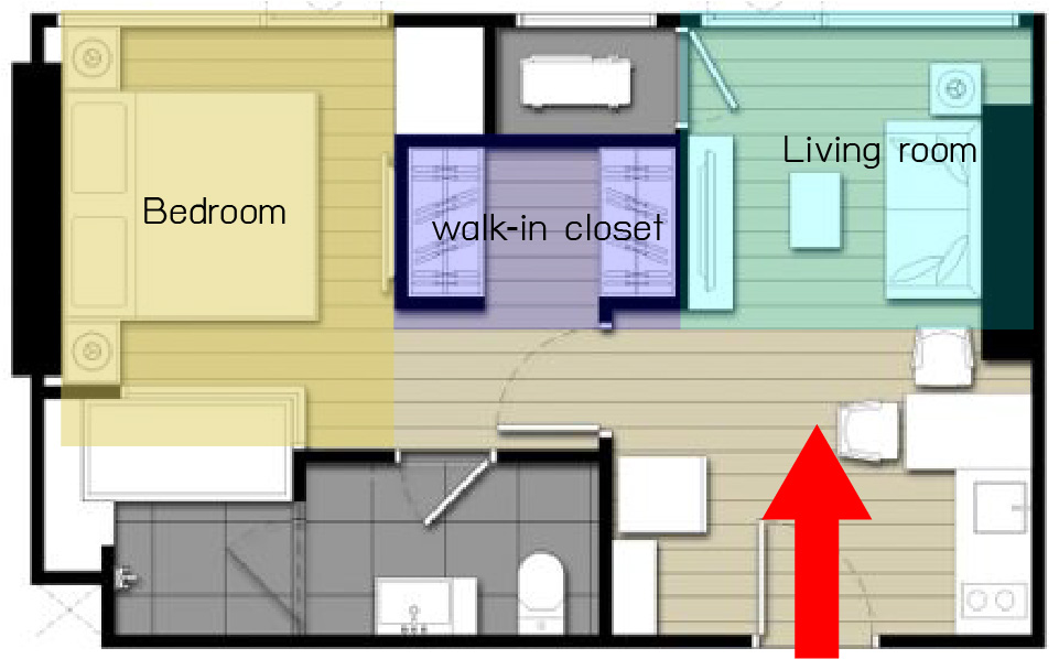 width can be separated into 3 areas which are a bedroom, a walk-in closet and a 2-meter long living room.