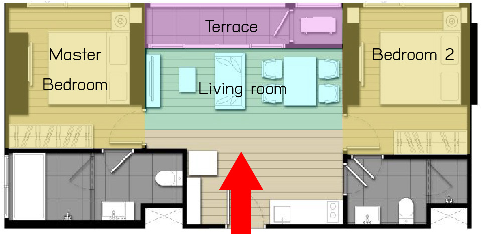 When you enter the room, you will face a pantry which is similar to the 1-bedroom design.