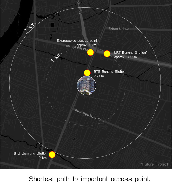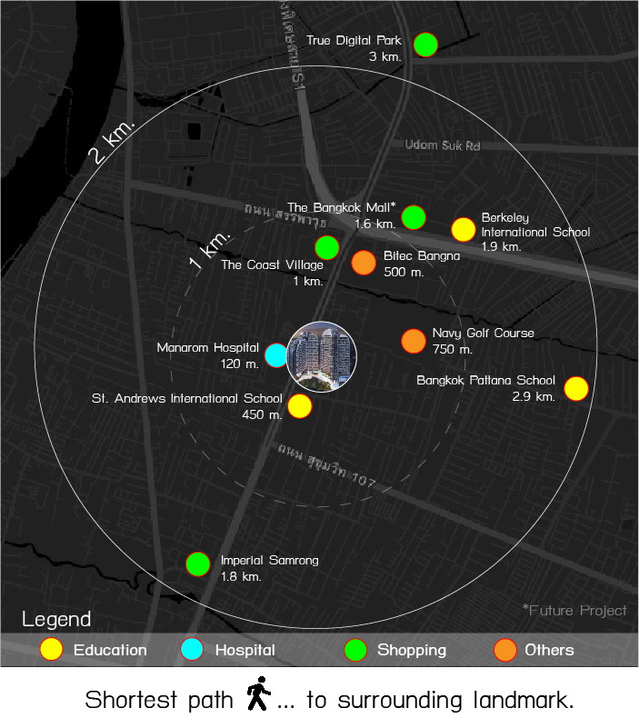 There are various shopping attractions within 3 kilometers of the area such as, The Cost Village near the project, True Digital Park is located towards the city center, and Tha Bangkok Mall on Bangna-Trad road which is a mega project on 100 rai land piece. This project will start the construction process in 2018 and plan to open in 2023.