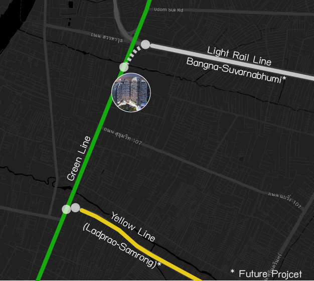 Another interesting route is the MRT yellow line (Lat Phrao – Samrong) which is in the construction process. It is planned to be finished at the end of 2021. The Samrong interchange station is only 1 station away from the Bangna BTS Skytrain station which is the nearest station from the project.