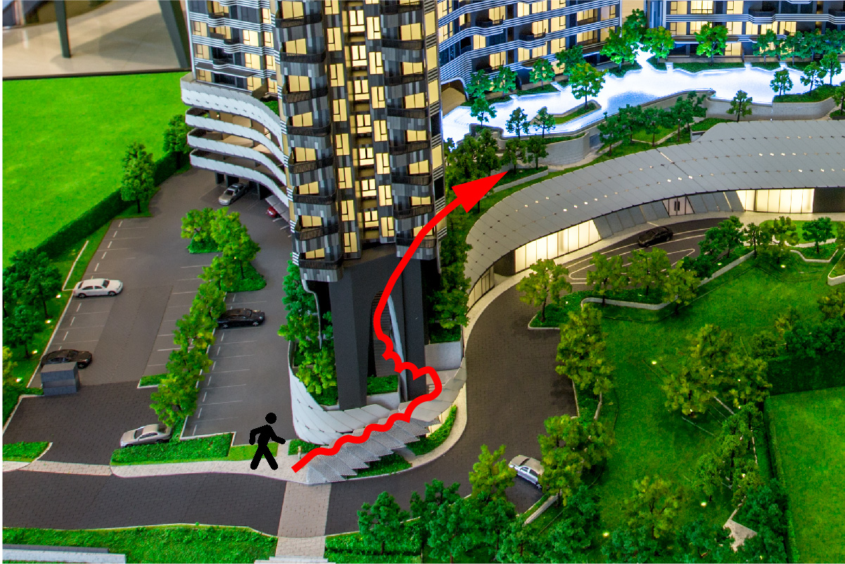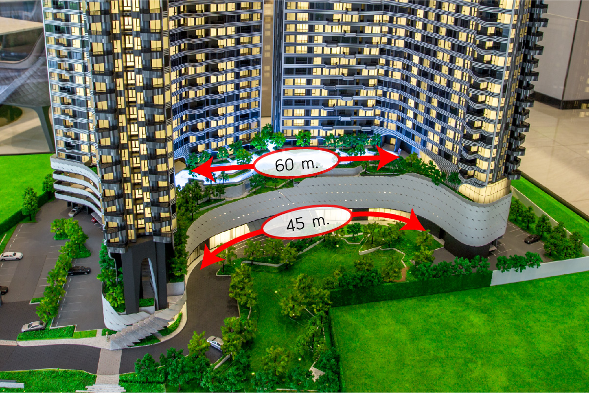 The broad span Lobby on the first floor is 45 meters wide. The big openings bring natural light into the building and lets residents enjoy grand panoramic views.