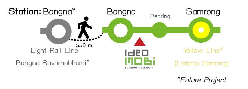 Another route is an LRT (Light Rail Transit) from Bangna BTS station to Suvarnabhumi Airport which is in an Environmental impact assessment (EIA) study. The Bangna LRT station, not a Bangna BTS Skytrain station, is planned to be near Bangna intersection and it can connect to BTS Skytrain route within 550 meters via skywalk from Bitec building. According to these mass transit plans, the area would be highly integrated with various transport modes in the future.