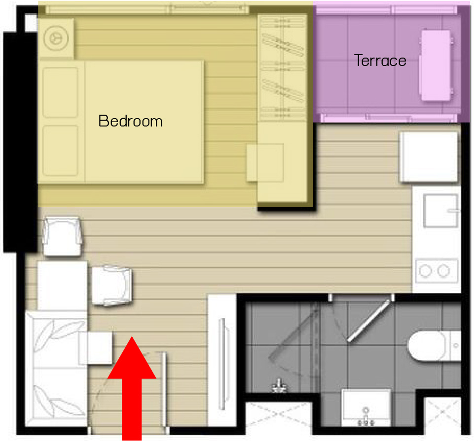 When you enter the room, you will face a living room which connects with a bedroom. The studio room has no partition to separate a space.