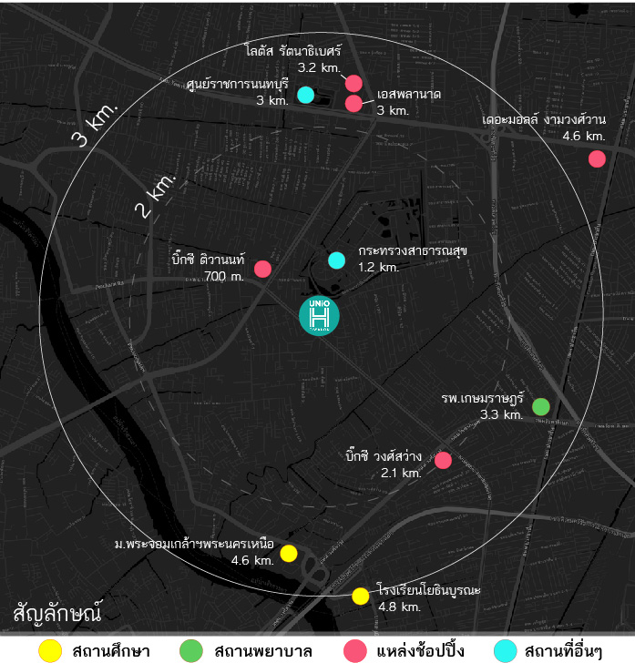 (โรงพยาบาลเกษมราษฎร์อยู่ใกล้ที่สุด) รวมไปถึงสถานศึกษาทั้งระดับอุดมศึกษา (ม.พระจอมเกล้าฯพระนครเหนือ) และระดับมัธยมศึกษาชื่อดังอย่าง โรงเรียนโยธินบูรณะ รวมไปถึงสถานที่สำคัญอื่นๆ เช่น ศูนย์ราชการนนทบุรี และกระทรวงสาธารณะสุข ซึ่งนับว่าพื้นที่นี้เป็นทั้งพื้นที่แหล่งงาน และพักอาศัย ตอบโจทย์การอยู่อาศัยและกลุ่มคนวัยทำงานย่านตัวเมืองนนทบุรีได้อย่างดี