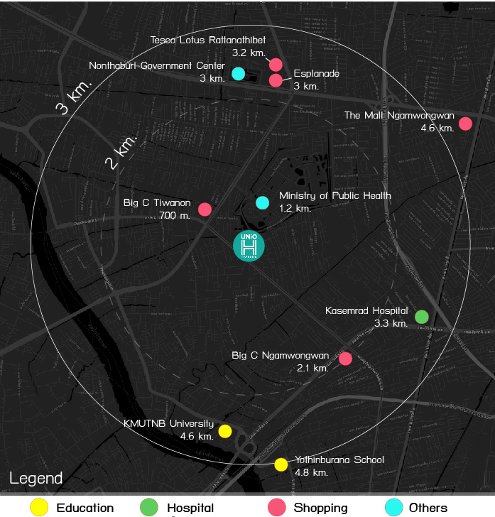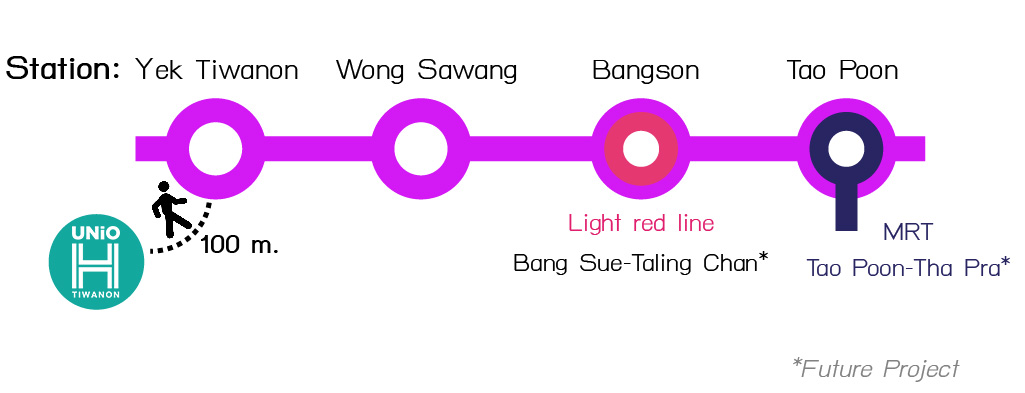 Unio H Tiwanon is located next to Bangkok-Nonthaburi Road, connect to several important road lines, such as Ratchadaphisek Road, Wongsawang Road, Nakorn In Road, and Tiwanon Road.