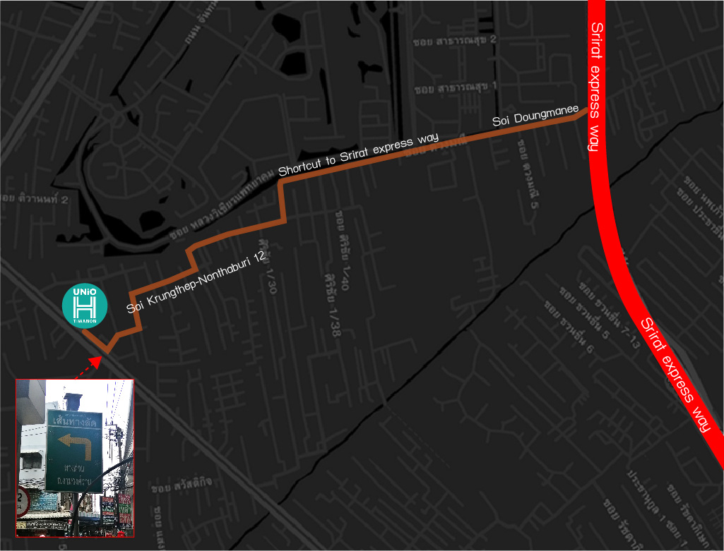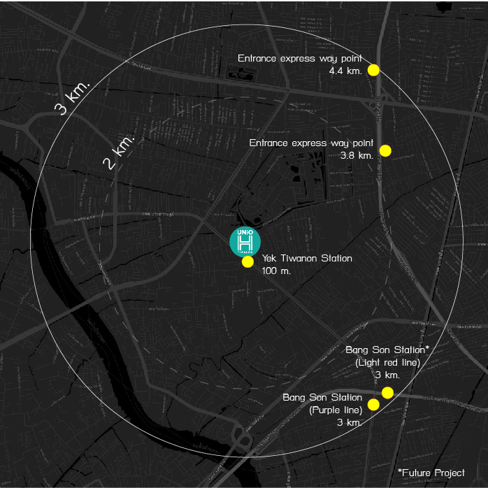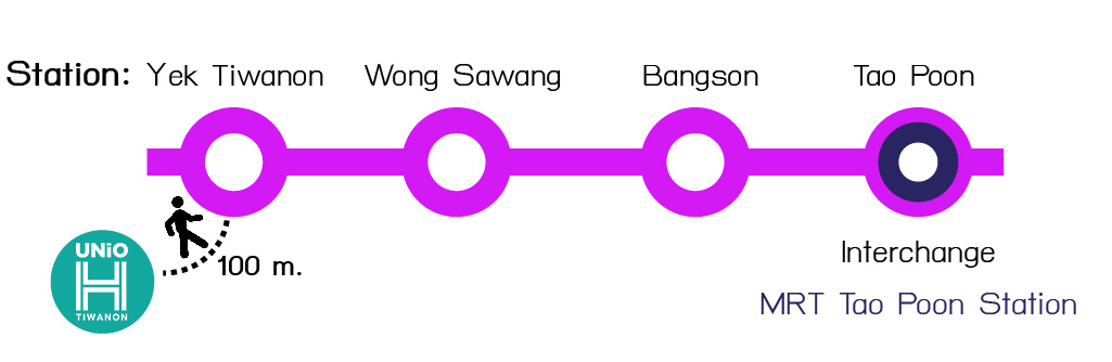 Unio H Tiwanon is located on an inbound side of Bangkok-Nonthaburi Road (Between Soi Krungthep-Nonthaburi 12-14). It is close to MRT Purple Line Yaek Tiwanon Station (about 100 meters) and Si Rat Expressway (ring road).