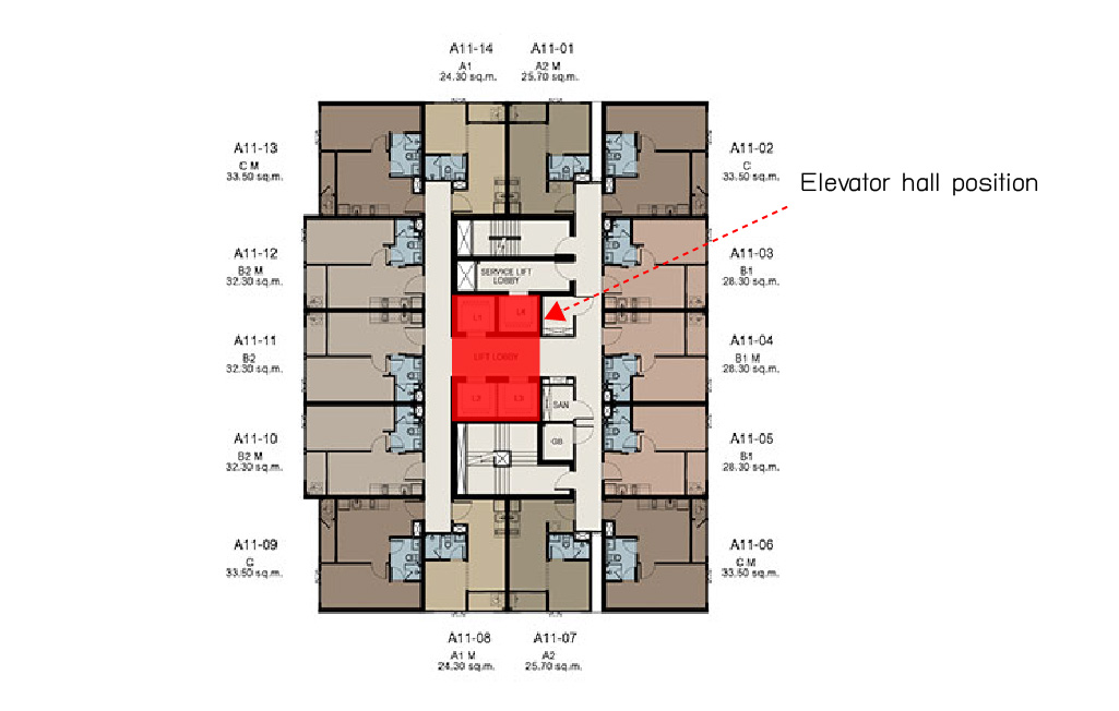As mentioned earlier, this layout is designed to isolate elevators which means it will not be attached to any rooms. In addition, most of the rooms will have a single corridor or single side hall which gives a private atmosphere. When you open the door, you will not face any opposite room. Rooms with the single corridor are the Type B, 1-Bedroom type.