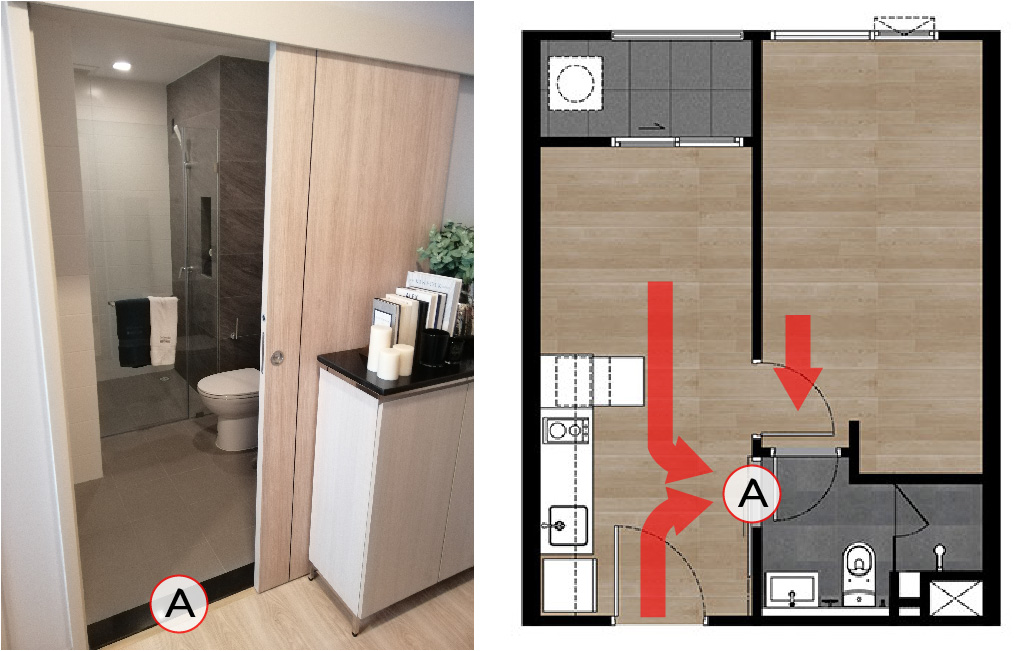 When you enter the room, first you will be in the shoe cabinet and the washing machine area (for A1 and A1M unit types, washing machines are on the balcony instead).