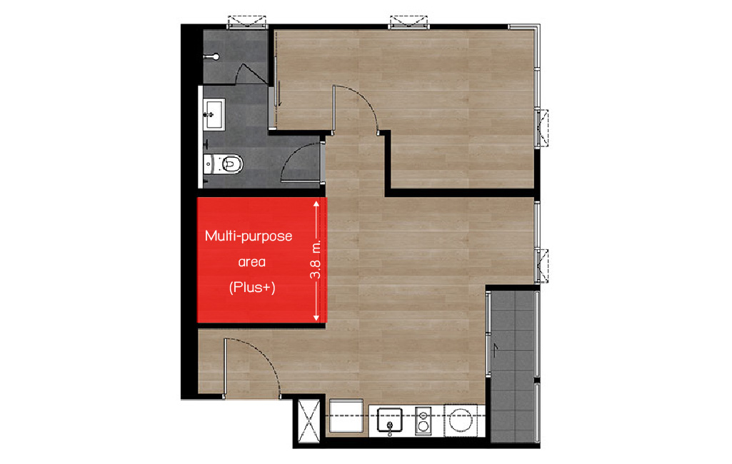 (This additional area is what “Plus” means). You can build a partition to transform a multipurpose area into a private working room or another small-size bedroom with a width of 3.8 meters.