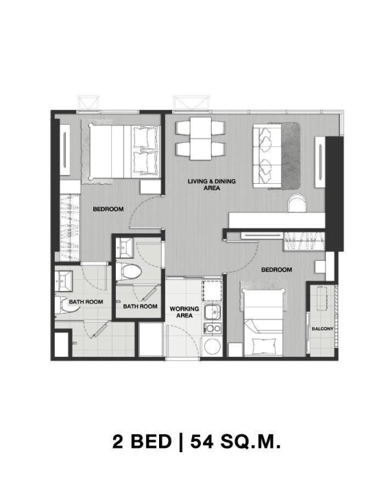 2 ห้องนอน 2 หอ้งน้ำ ขนาด 55.15 ตร.ม.
