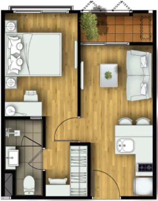 รายละเอียดของห้อง: 32 ตร.ม /ชั้น 2 /วิวสระว่ายน้ำ/ตึก B /1 ห้องนอน /1 ห้องน้ำ