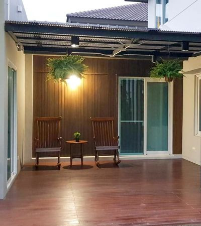 ระเบียงยาวหน้าบ้านพร้อมสนามหญ้า