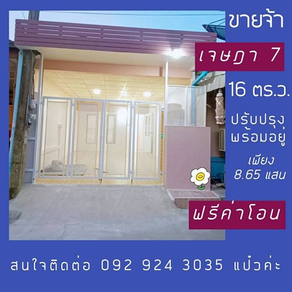 ขายทาวน์เฮ้าส์ 200/260 เจษฎา 7 ถนนเมน ตรงข้ามซอย 20 ชั้นเดียว 16 ตร.ว. โทร 0929243035