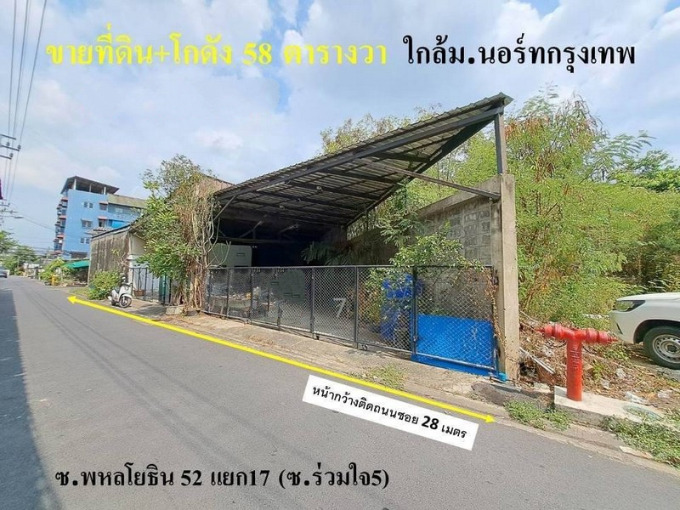 ขายที่ดิน พร้อมโกดัง 58 ตรว. ซ.พหลโยธิน52 แยก17 (ซ.ร่วมใจ5) ใกล้ ม.นอร์ทกรุงเทพ ตลาดยิ่งเจริญ สนามบินดอนเมือง สถานีสะพานใหม่ ถ.เทพรักษ์ ถ.รามอินทรา ถ.วิภาวดีรังสิต ถ.สุขาภิบาล5 ถ..เพิ่มสิน ถ.แจ้งวัฒนะ