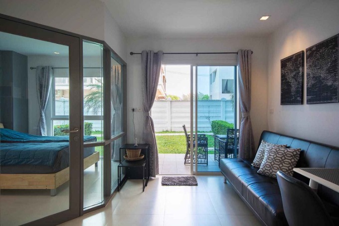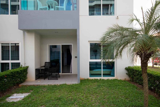 GrandBlue Condominium is located by Mae Phim Beach, offering the largest swimming pool available in the area, among other facilities such as a fitness center and sauna. The condominium also includes a restaurant and bar, making it a solid investment opportunity with good rental potential. You will have all the necessary services you need right at your doorstep. The unit is fully and tastefully furnished, so you can simply step in and start enjoying your new home. This corner ground floor unit gives you a secluded garden right in front of you for relaxation.
