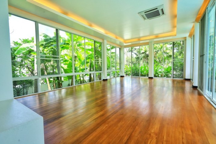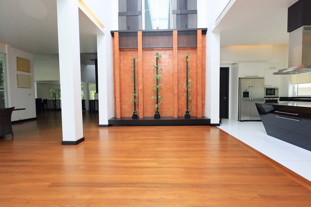 โถงกลางบ้านเพดานสูงแบบ Double Volume มีช่องเปิดรับแสงธรรมชาติจากภายนอก เพิ่มความปลอดโปร่งให้กับตัวบ้าน ตลอดจนผนังกระจกบานใหญ่รอบบ้าน ที่จะทำให้สามารถมองเห็นสวน และสระว่ายน้ำได้จากทุกมุมของบ้าน