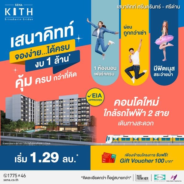 คอนโดใหม่ ใกล้รถไฟฟ้าศรีด่าน จองง่าย..ได้ครบ..งบ 1 ล้าน เสนาคิทท์ ศรีนครินทร์-ศรีด่าน ฟรีเฟอร์ฯทั้งห้อง