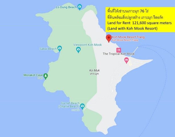 ให้เช่า ที่ดินเกาะมุก จ.ตรัง พื้นที่ 76 ไร่ เป็นรีสอร์ทติดชายหาดทะเล 15 ไร่ สามารถดำเนินกิจการต่อได้เลย หรือหากต้องการเปลี่ยนแปลงรื้อถอนกิจการเดิมและสร้างกิจการใหม่ก็สามารถทำได้ในพื้นที่ดินทั้งหมดรวม 76 ไร่