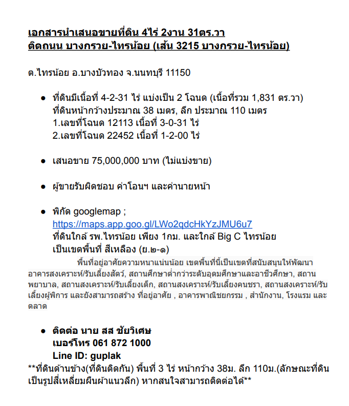 ที่ดินใกล้ รพ.ไทรน้อย เพียง 1กม. และใกล้ Big C ไทรน้อย