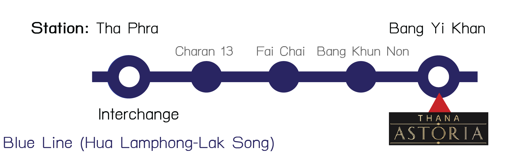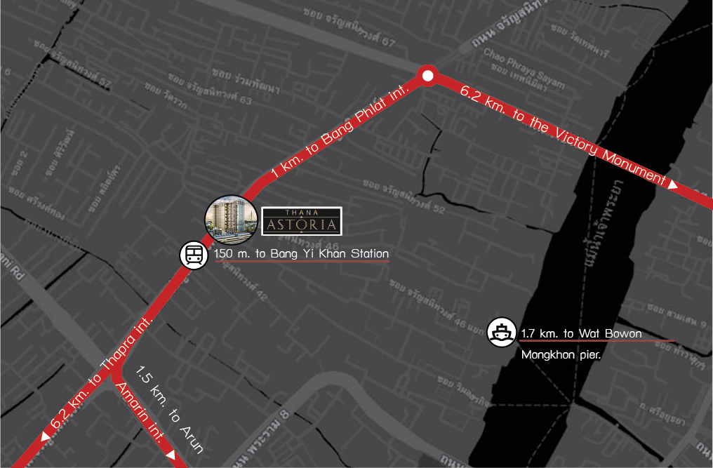 In conclusion, Thana Astoria location can easily connect to other areas via various transport modes which are MRT (Coming soon), boat, cars, and other public transportation. Residents can access key attractions in the area easily by private vehicles, the Condominium is located only 1km from Bang Phlat intersection, 1.5 from Arun Ammarin intersection and 6.2 km. from the heart of Bangkok (Victory Monument) which will be the same distance traveling to Thra Pra Intersection.