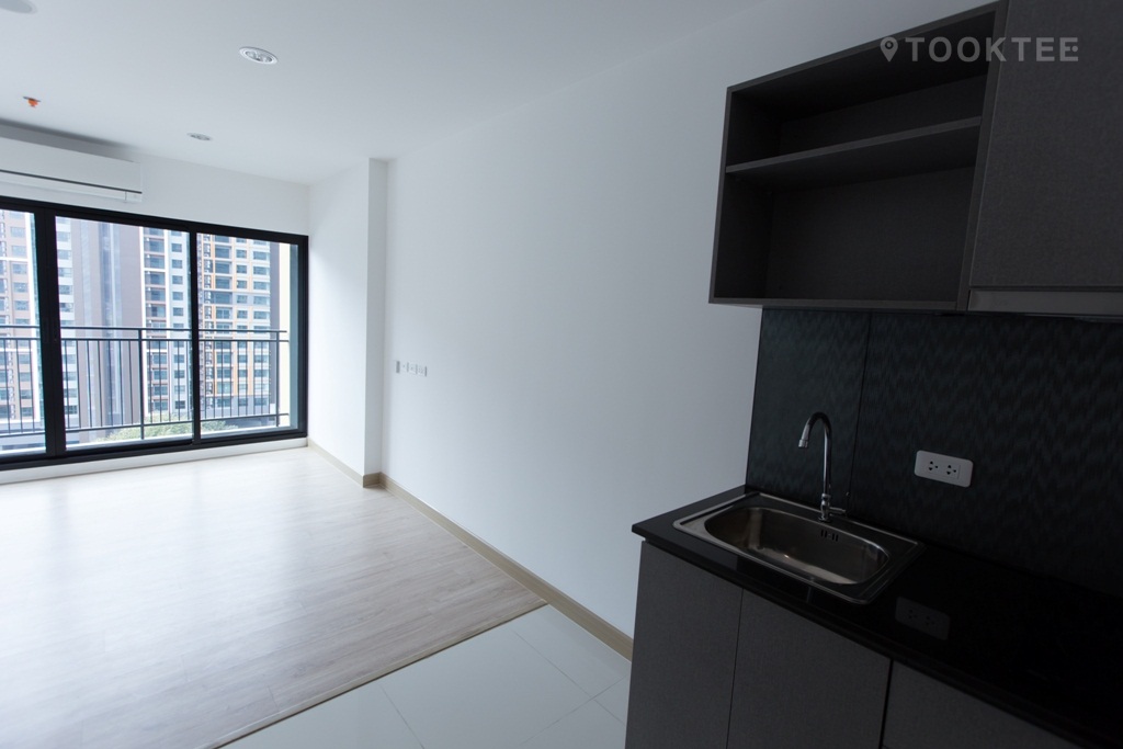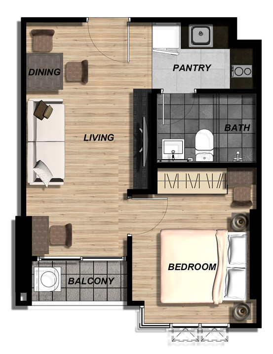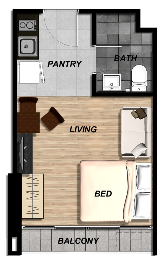 แปลนห้องสตูดิโอ จะเป็นแบบหน้าแคบตัวห้องยาวเข้าไปเป็นสี่เหลี่ยมผืนผ้า เมื่อเข้าห้องมาจะแยกเป็นมุมครัว (Pantry) และห้องน้ำ ถัดมาจะเป็นพื้นที่นั่งเล่นที่เชื่อมต่อกับพื้นที่ห้องนอนโดยที่ไม่มีผนังกั้นแยกพื้นที่ใช้สอย ซึ่งจากจุดที่วางเตียงนอนสามารถมองเห็นวิว จากทางระเบียงได้เลย ระเบียงยาว สามารถวางเครื่องซักผ้าขนาดความจุประมาณ 10 กิโลกรัม ซึ่งห้องรูปแบบนี้เหมาะกับการอยู่ 1-2 คน แบบที่ต้องการเนื้อที่ใช้สอยมากกว่าการกั้นพื้นที่ให้เป็นสัดส่วน รูปแบบห้องค่อนข้างโปร่ง เนื่องจากไม่มีการกั้นห้อง