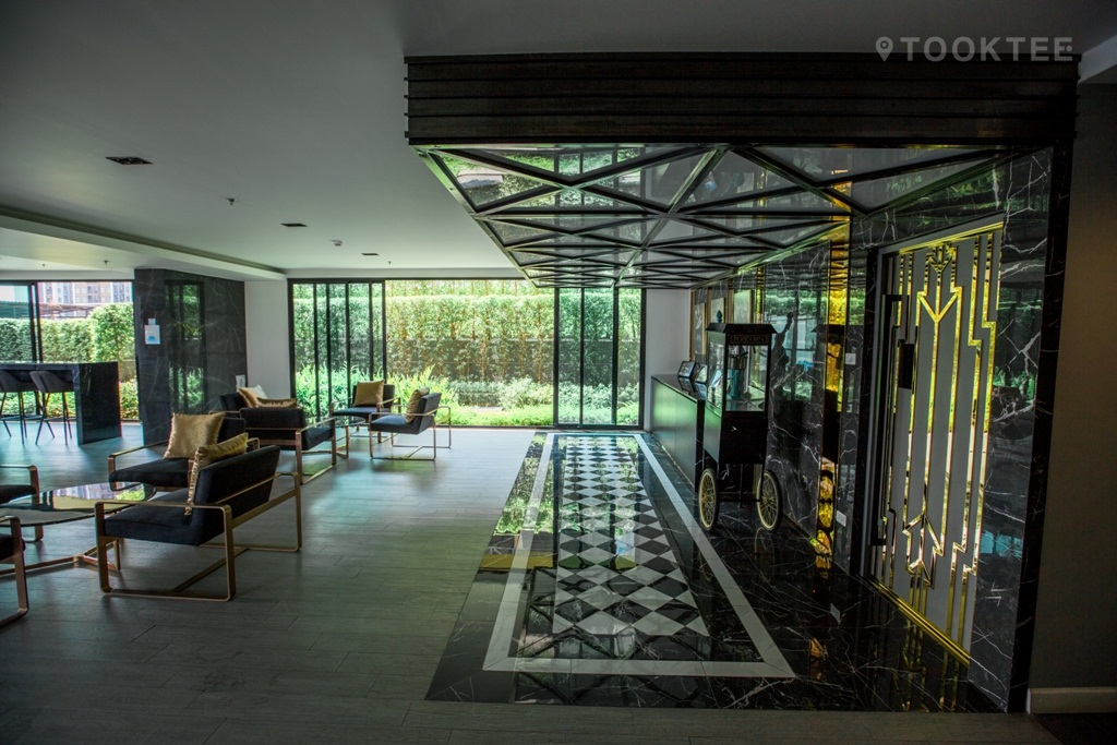 ภายในอาคาร (พื้นที่ส่วนกลาง) เน้นการใช้วัสดุที่สะท้อนแสงทั้งหินอ่อน รวมไปถึงกระจก โทนสีดำตัดกับสีขาว โดยเน้นขอบสีทอง สไตล์เรียบ-หรู